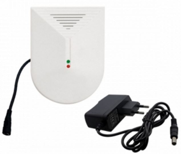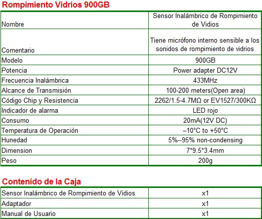 Detector inalámbrico de ondas sonoras de rompimiento de vidrios. Para su funcionamiento requiere de un adaptador de corriente de 12v.